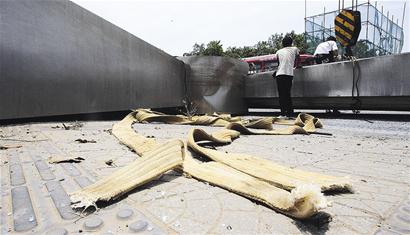 現場的一名施工人員稱該鋼雕重約10噸。前晚他們在拆除馬路對面的另一只“翅膀”時,也是采用這種合成纖維吊裝帶。