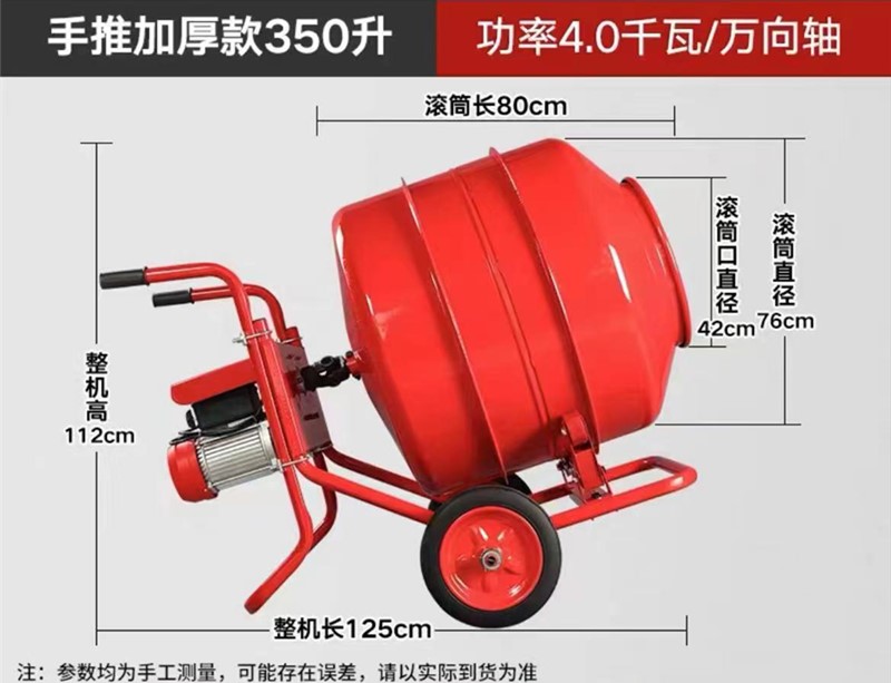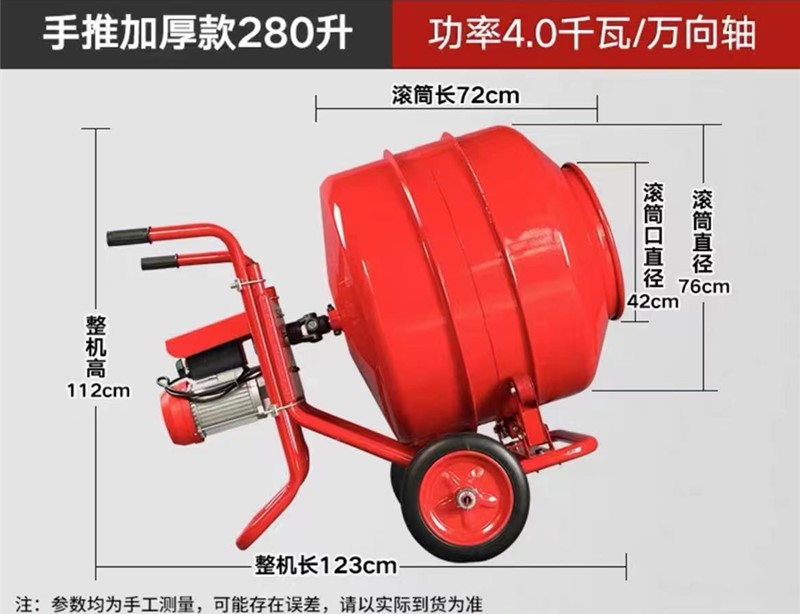 手推臥式小型攪拌機有280升、350升、400升、600升、800升共5種規格。